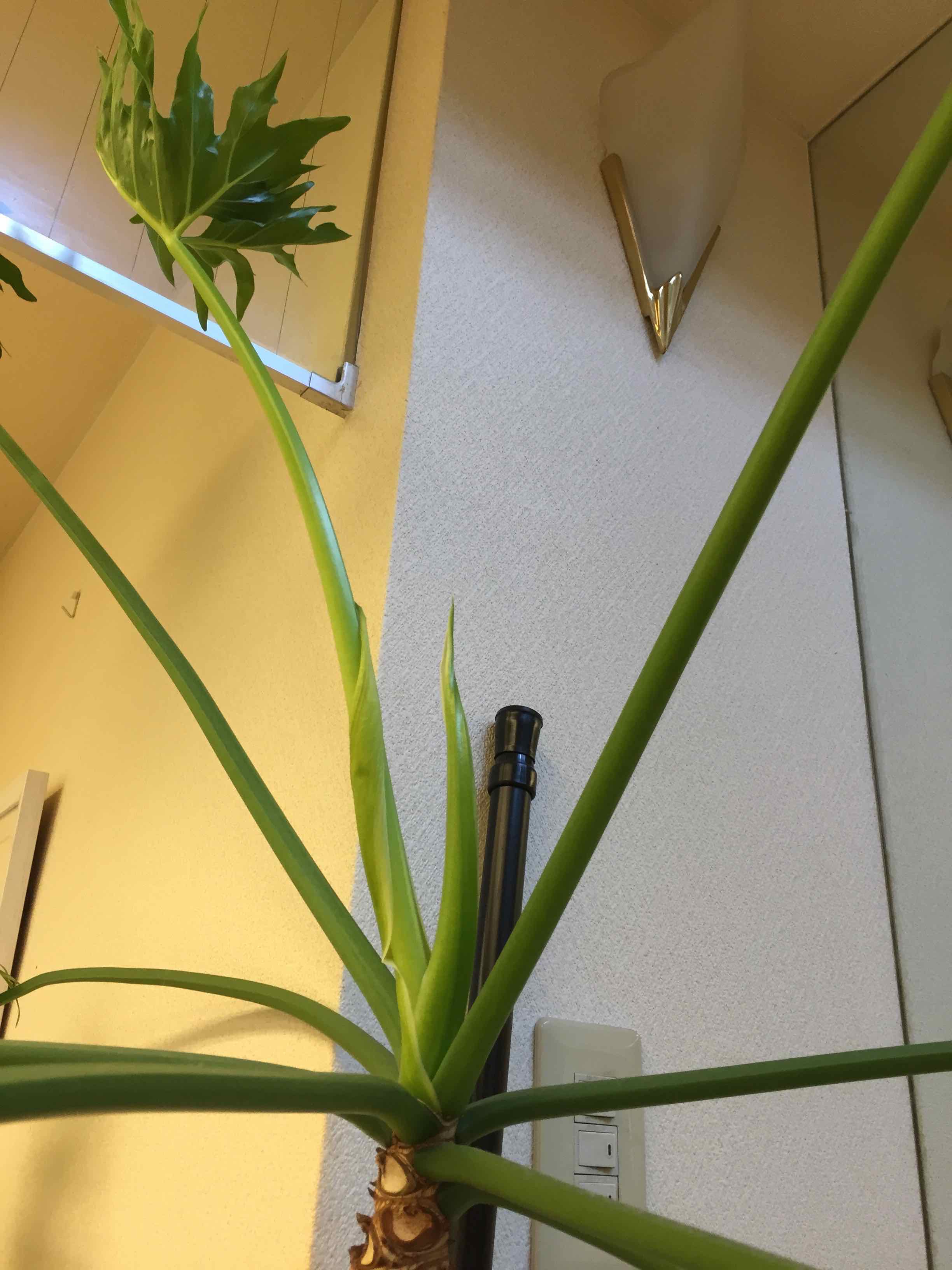 朝、職場に来てみてふと見上げたらセロームの赤ちゃんが生まれていました。 この観葉植物は治療院の開業祝いに子供達たちから貰ったものですがあまり世話も していないのに8年も一緒に頑張ってくれています。 お日様が射す方向に育ってしまい、とうとう独り立ちできなくなって支えの杖をしたり 幹も細くなってしまっていますが生命力は旺盛です。 新緑の時期になると幹だと思っていたものからちっちゃやクリームパンのような赤ちゃん葉っぱが 開いていたりして楽しみです。手間も掛からないので緑が欲しい方にはお薦めです。
